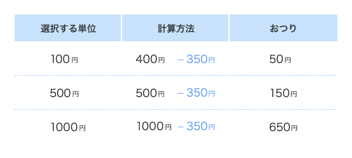 例えば、通勤途中にあるコンビニで購入した税込み350円のお弁当。通常、クレジットカードや電子マネーで決済すると「おつり」は発生しませんが、少し多めに支払うことで意図的に「おつり」を作り出します。アプリで選択できるのは、「100円」「500円」「1000円」の3段階。単位ごとの計算方法は次のようになります。