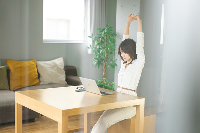 まずは、体への負担が少ない椅子を選ぶことが大切です。椅子の高さやクッション性が自分の体に合っているものが良いでしょう。基準としてはデスクワークをしようとした時に、自然にあごを引いて骨盤が立つような姿勢が取れるものを選んでください。