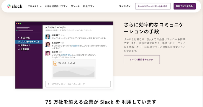 世界中で多くのユーザーが愛用するSlack。プロジェクトに応じてチャンネルを作り、関係メンバーがやり取りを行います。情報整理が簡単なのがポイントで、拡張性も高く、体制に応じたカスタマイズも可能。使い慣れていくほど、利便性の高さを感じるでしょう。一方でチャットツールに不慣れな人にはハードルが高いかもしれません。