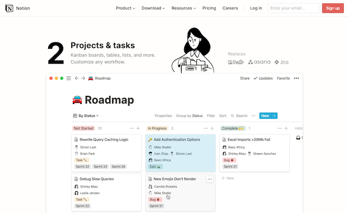 情報をメモしたり、表計算データを作成したり、あるいはタスクを管理したり、スケジュールを作成したり。ファイルの作成と共有以外にも、同じアプリの中でプロジェクト進行やスケジュール管理ができたら便利ですよね。例えば、Google ドキュメント、Trello、Evernote、Googleカレンダーなど、これまで用途に応じて使い分けていた複数のツールもこれからは「Notion」ひとつでOK。