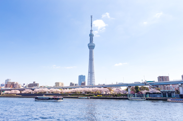 東京エリアで圧巻なのは、吾妻橋〜桜橋までの約1kmに渡る両岸の桜並木。江戸時代・8代将軍吉宗によって作られ、「隅田川の千本桜」とも呼ばれる桜の名所を、春風に吹かれながらのんびり楽しめます。スカイツリーを背景にして広がる満開の桜は、まるで絵に描いたような美しさ。最高の接待になるでしょう。