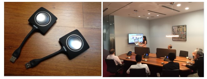 会議室で使えるのは、「Clickshare(クリックシェア)」というワイヤレスのプレゼンテーションツールです。パソコンのUSBにClickshareをつないでボタンを押すと会議室のディスプレイに表示したい画面をすぐに表示できる便利なツールです。