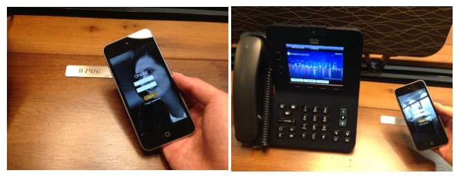 使い方は簡単で、OneApをインストールしたスマートフォンを共用デスクにあるOneApロゴの上に置きOneApを起動するだけ。サーブコープのオフィスから退出すると自動的にログアウトされるので、解除する必要はありません。