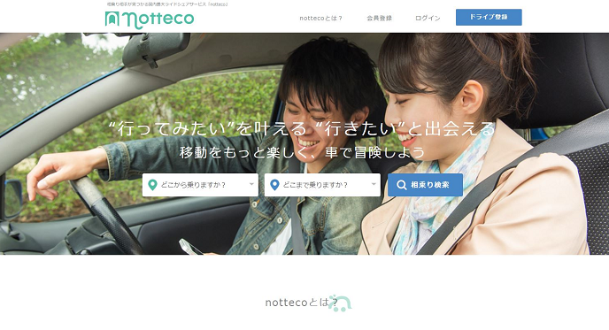 2007年のサービス開始以来、40,000人以上の会員数と年間7,000ドライブを突破した日本最大の相乗りマッチングサービス「notteco」。相乗りすることでドライバーも同乗者も経費を抑え格安で移動することができ、渋滞緩和や排ガス削減など環境への貢献にもつながっています。