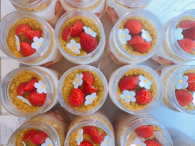 プラスチックのボトルに、大粒のイチゴとシロップをたっぷり含んだスポンジ、上質なクリームを層にして詰められています。1個に入っているのは、2つ分ぐらいの量。一人でも、分けても食べられるケーキです。ボトルの側面からは、ショートケーキの断面が見えて、とってもかわいいので喜んでいただけます。特別な日のお土産にぴったりです。