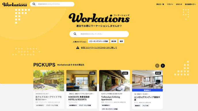 いざワーケーションをしたいと思っても、宿泊施設探しに悩む人も少なくないでしょう。そこでおすすめしたいのが、ワーケーションに特化した検索サービス「Workations(ワーケーションズ)」です。このサイトの特徴は、ワーケーションができる施設のみを登録していること。現在は、約40の宿泊施設が登録され、「連泊割」や「コワーキングスペース完備」など、条件をつけて検索できるのも魅力です。