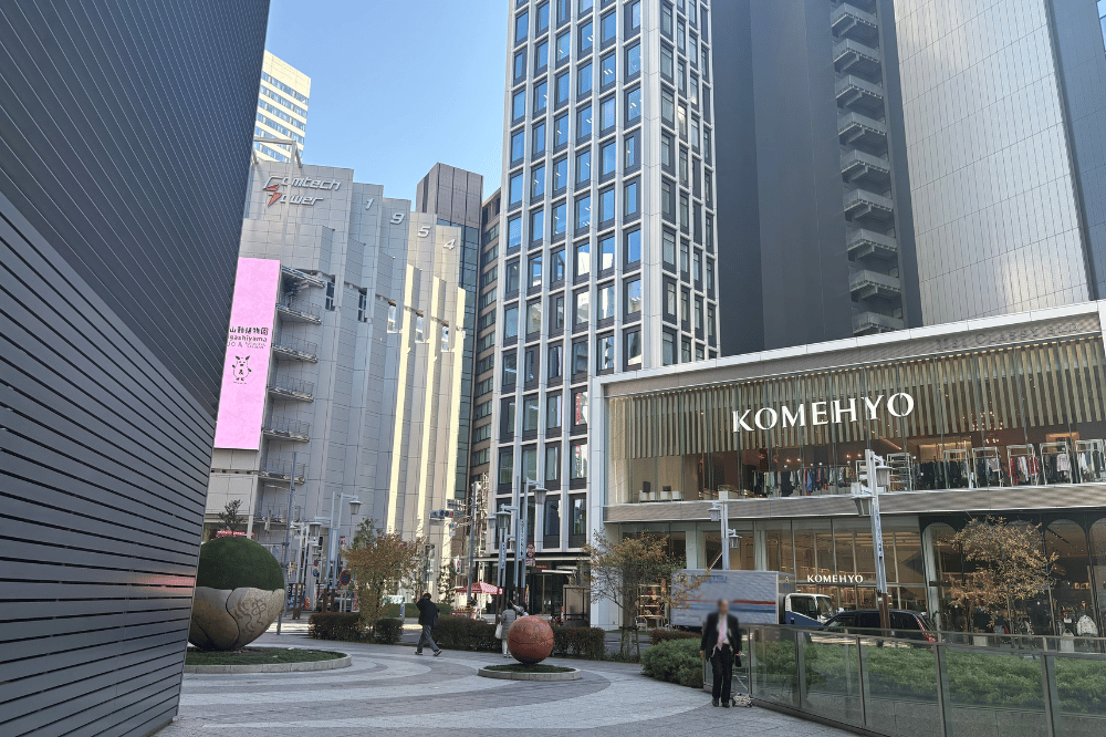 4. 道路の向こう側にKOMEHYOのビルがあります。「名駅四丁目西」の交差点を渡り、KOMEHYOビルの横、エニシオ名駅の入口からお入りください。館内に入って右手にあるエレベーターで16階までお上がりいただくと、サーブコープエニシオ名駅拠点に到着します。