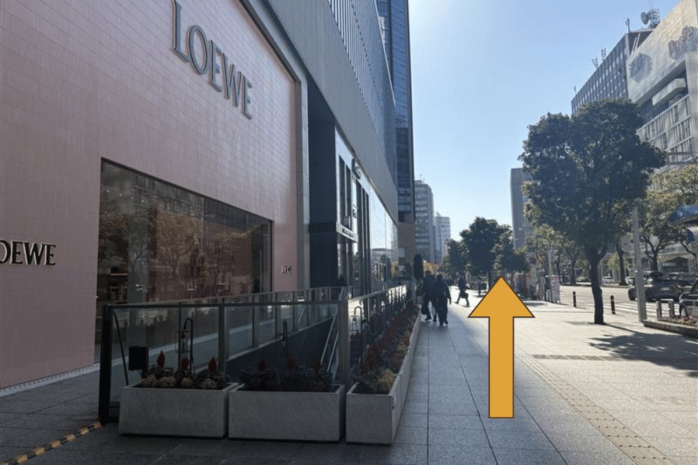 3. 渡ったらすぐ右に曲がり、そのまま真っすぐ左手にブランドショップが並ぶ道を進みます。ルイ・ヴィトンまで歩いたら、建物沿いに左へ曲がります。