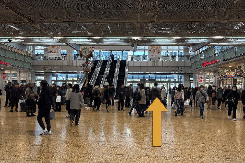 1. JR名古屋駅中央口からのアクセスをご紹介します。地下からもビル直結でお越し頂けます。地上からは、中央口を出てすぐ右方向、高島屋方面(金時計側)にまっすぐ進みます。