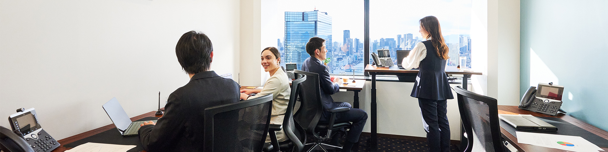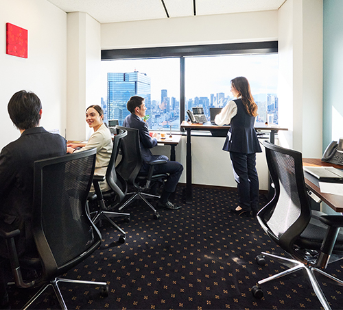 レンタルオフィスとは、机・椅子などの家具、インターネット、電話回線、プリンターなどのオフィス設備があらかじめ整っており、すぐに仕事を始められる賃貸オフィススペースのことです。通常の賃貸オフィスと比べて、初期費用や契約手続きの手間が少なく、必要なオフィスの広さ・期間だけ利用できる柔軟性が特徴です。 サーブコープのレンタルオフィスは、個人事業主や中小企業にグローバル企業に匹敵する充実したインフラとネットワークを提供しています。充実したオフィス設備、プロフェッショナルな秘書チーム、最先端のITサービスを他の企業と共有することで、コストを大幅に削減しながら、世界最高水準のオフィスやサービスを利用することが可能です。