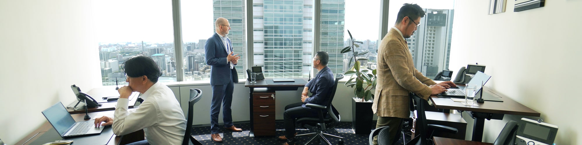 レンタルオフィスとは、机・椅子などの家具、インターネット、電話回線、プリンターなどのオフィス設備があらかじめ整っており、すぐに仕事を始められる賃貸オフィススペースのことです。通常の賃貸オフィスと比べて、初期費用や契約手続きの手間が少なく、必要なオフィスの広さ・期間だけ利用できる柔軟性が特徴です。 サーブコープのレンタルオフィスは、個人事業主や中小企業にグローバル企業に匹敵する充実したインフラとネットワークを提供しています。充実したオフィス設備、プロフェッショナルな秘書チーム、最先端のITサービスを他の企業と共有することで、コストを大幅に削減しながら、世界最高水準のオフィスやサービスを利用することが可能です。